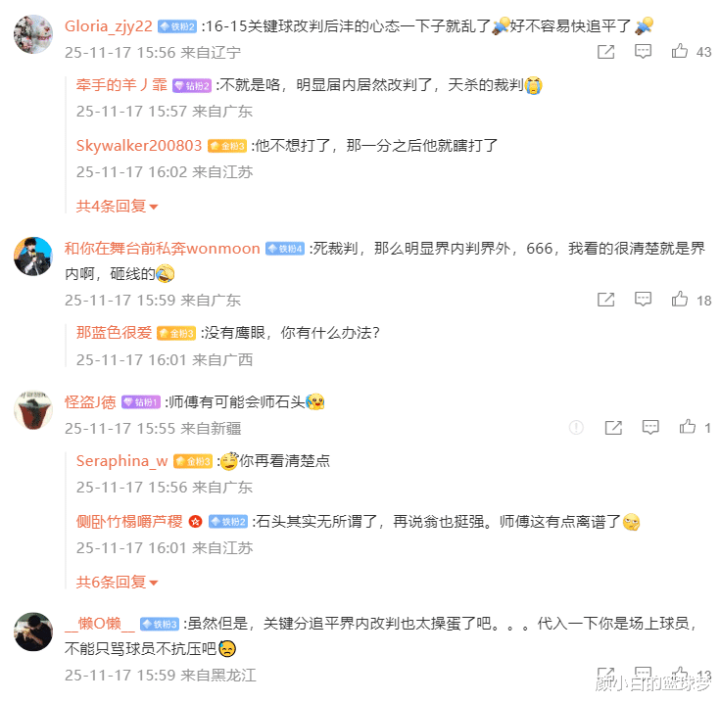 这场比赛的赛后球迷们都在讨论第三局的关键一分,那就是李诗沣15-16追到只差一分那个球,那个球被裁判改判界外,所以分数又变到14-17分,原本追到只差1分,瞬间差距又来到三分。