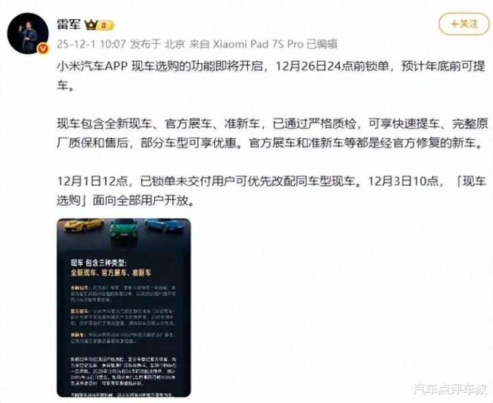 综合来看,小米汽车在交付量稳步攀升、销售网络快速扩张之际,推出体系化的现车选购服务,是一次有针对性的市场响应与运营升级。它短期内瞄准了交付痛点,中期服务于品牌体验与运营优化,长期则可能参与到行业服务模式的演进之中。在新能源汽车竞争日益侧重于全链条体验的今天,类似举措预示着竞争维度正在从单纯的产品力、价格,延伸至交付效率、服务灵活性与用户信任感的构建。小米汽车的这次尝试,效果如何,市场与消费者将给出最终的答案。