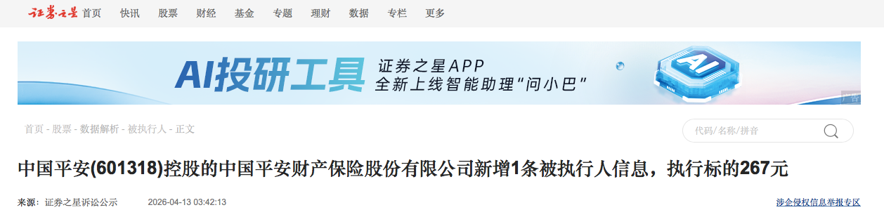 证券之星消息,根据天眼查-司法案件数据整理,4月8日中国平安(601318)控股的中国平安财产保险股份有限公司新增1条被执行人信息,执行标的267元。被执行人信息如下: